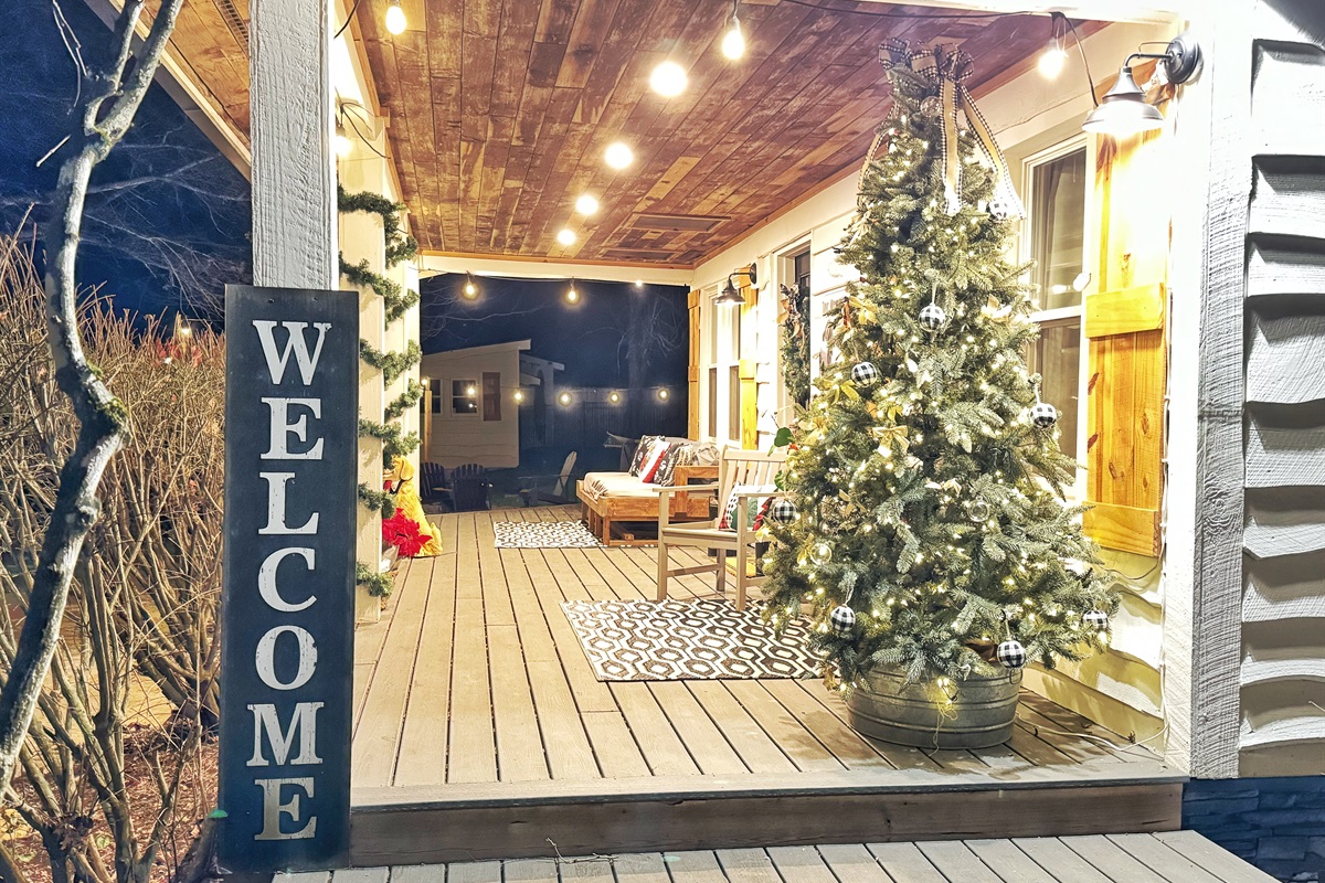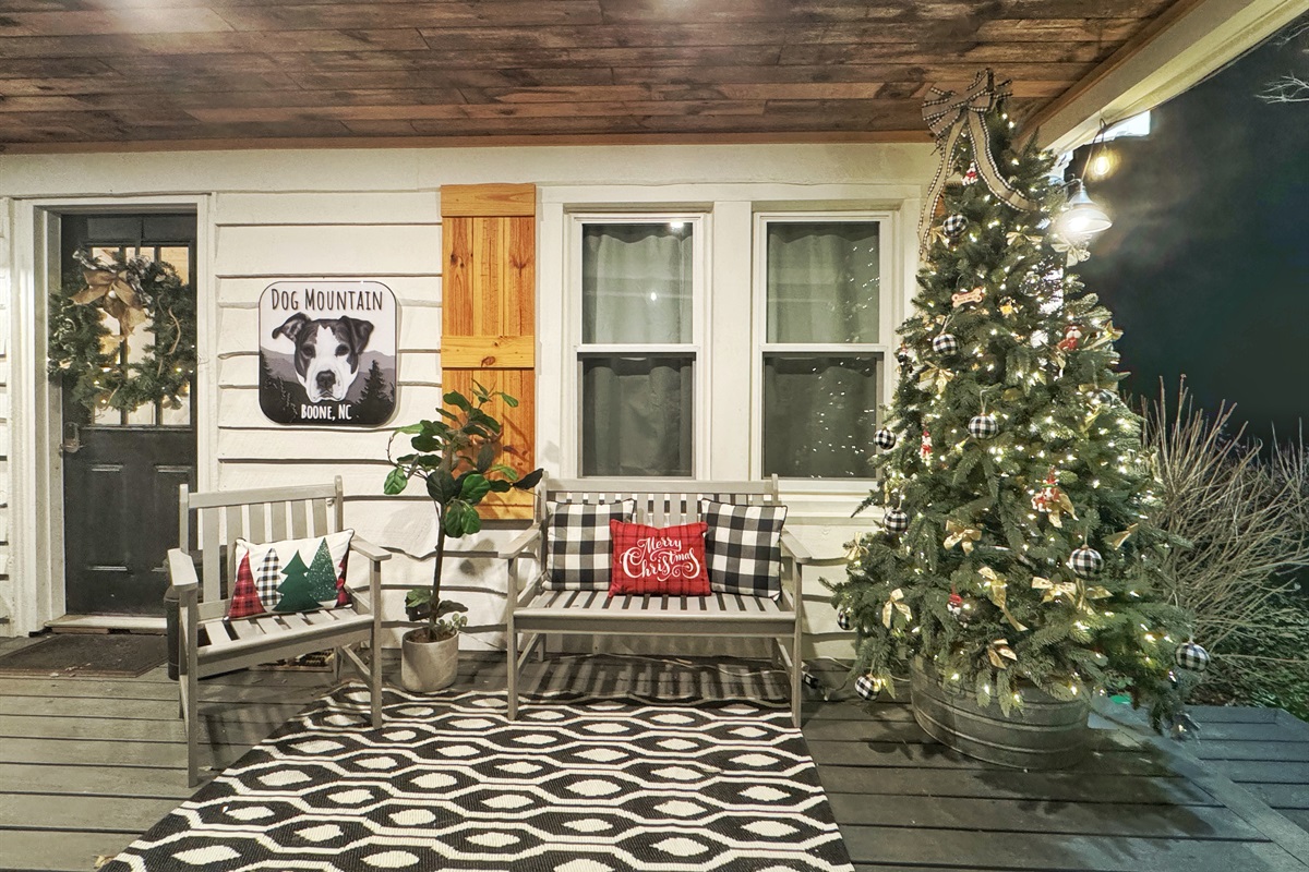 When you arrive at Dog Mountain you will be greeted by a creek and private pond that are surrounded by an abundance of trees. Park your car in the multi-car driveaway and step onto the large wrap around porch. The covered patio has a daybed and a seating area that is surrounded by string lights creating the perfect spot for a morning coffee, a glass of wine at the end of the day or just a relaxing place to recharge anytime during your stay.