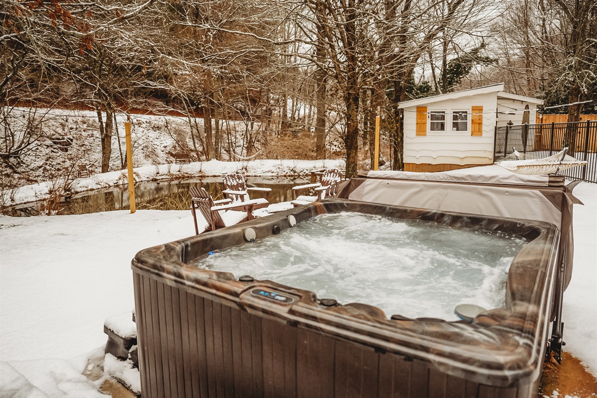 The backyard contains a fully fenced area that makes it safe and easy to bring your furry family member with you for your stay – it even includes a poop station! The backyard also includes a propane grill for grilling out and a six-person table to enjoy a great meal outside, whether it be under the sun or the stars. You will enjoy the beautiful sounds of birds singing in the trees and frogs croaking in the pond. If you are lucky, you may even see some wildlife. The fire pit is surrounded by string lights that makes it a cozy place perfect for a romantic time with your special someone or a fun time making s’mores. Another brand-new addition to the cabin is a four-person hot tub equipped with a waterfall and Bluetooth sound system, which is sure to be a place that you will want to enjoy more than once during your stay. A small treehouse is tucked away at the rear of the backyard and provides a secluded spot to enjoy a moment of stillness.