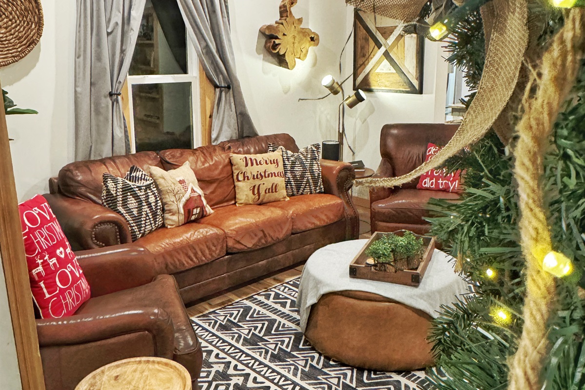 Once you open the door to the cabin you will immediately enter an open concept living space with beautiful natural wood ceilings. The living room has comfortable seating options allowing you to enjoy the 65-inch Roku TV, which includes complimentary access to Netflix, HBO Max, Amazon Prime Video and Disney+. If you would like to create a cozy ambience, turn on the gas fireplace located under the mantle created from an original 1960’s beam from when the cabin was built. A variety of board games and puzzles are also provided in the living room.